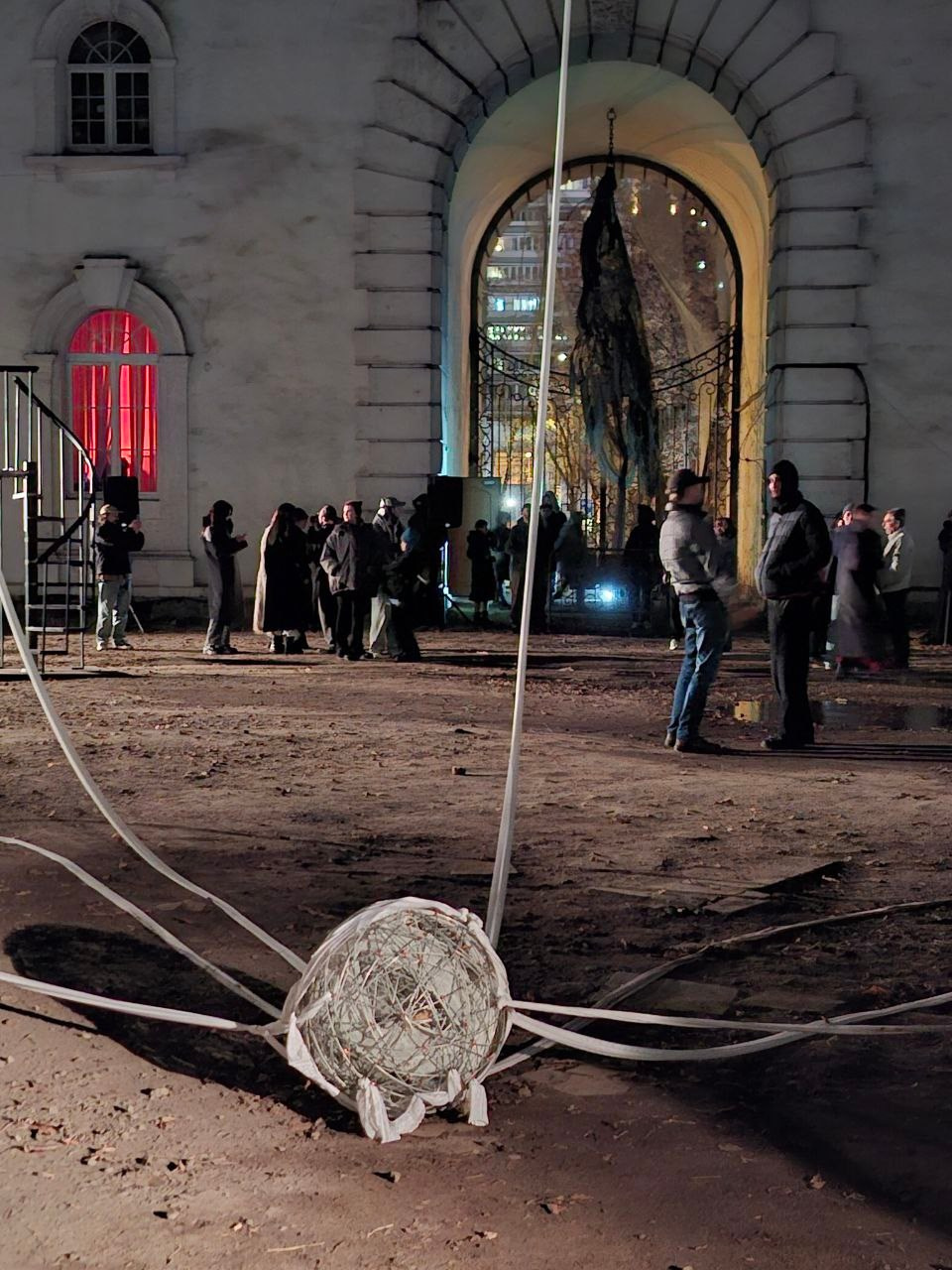 Инсталляция — site-specific высказывание, развёрнутое на площади под мостом у Красненькой речки. Семь работ на хлопковых тканях подвешены к деревьям с помощью тросов. В центре композиции — шар, сплетенный из проволоки и бинтов. От него к каждой работе протянуты бинты, проходящие сквозь ткани. Таким образом создаётся материальная система связей, где каждое произведение становится проводником общего напряжения и одновременно частью исцеляющего целого.